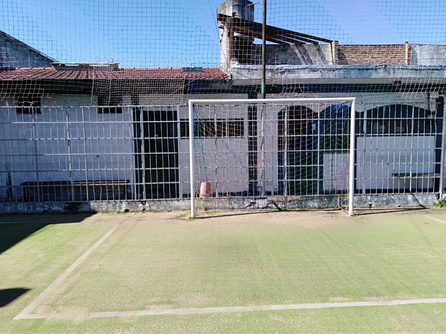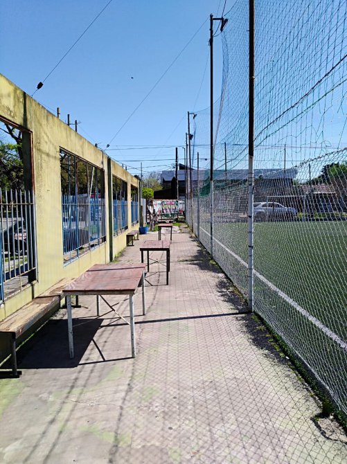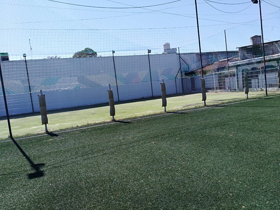Dos cachas de futbol 5, vestuario, sala con cocina y barra de atención, baño de hombre y de mujer.