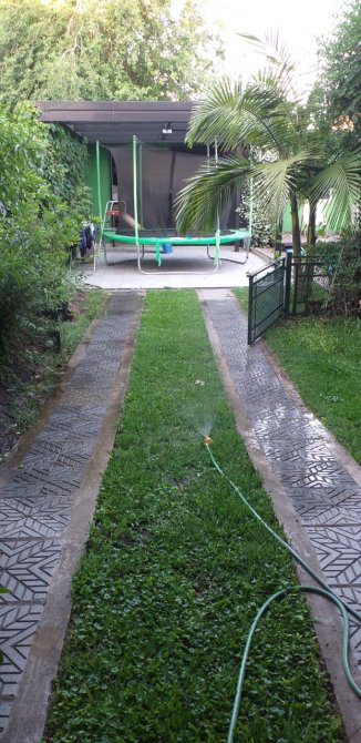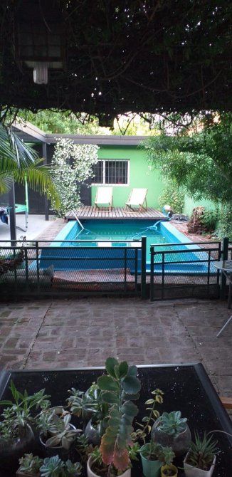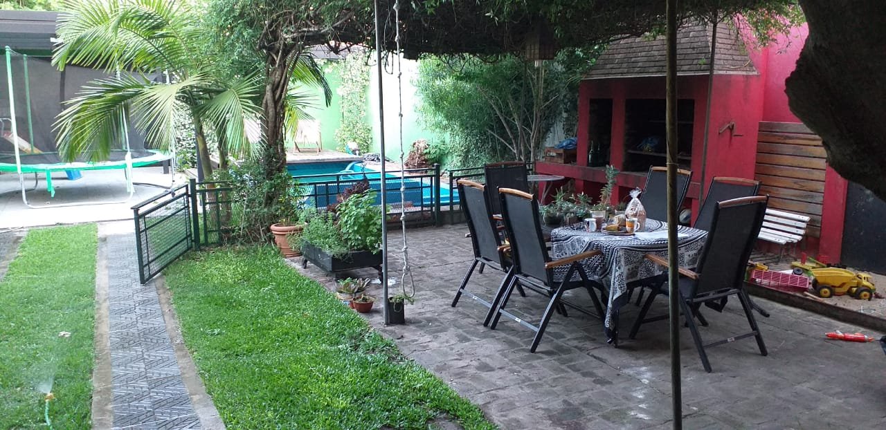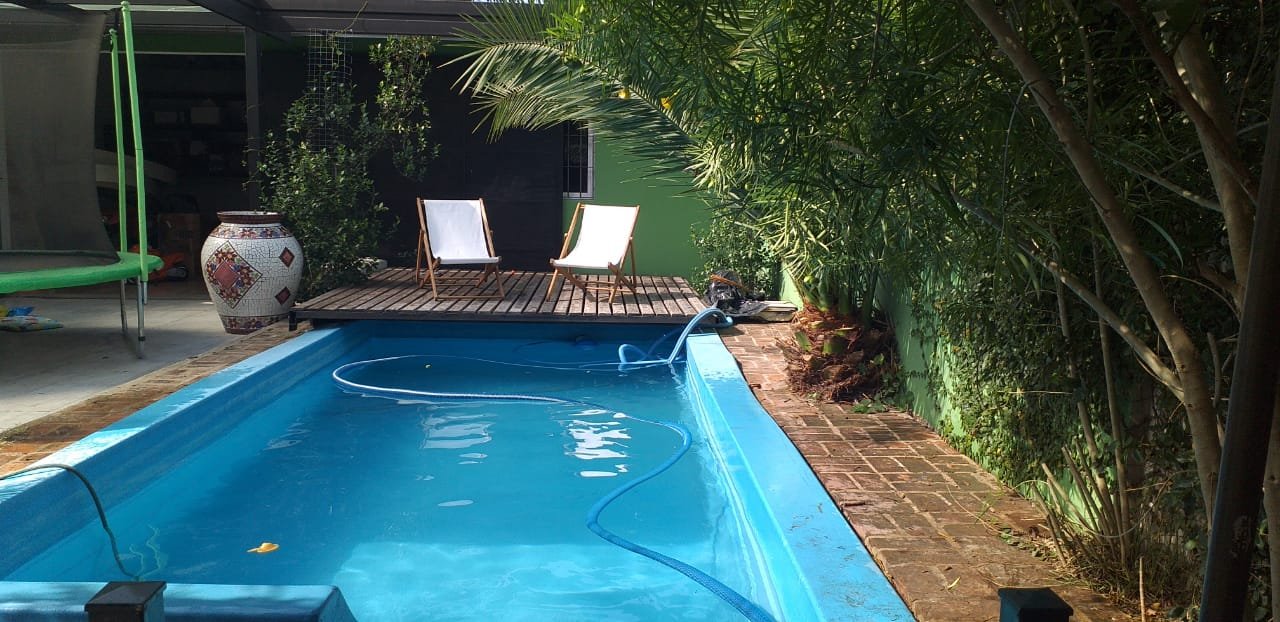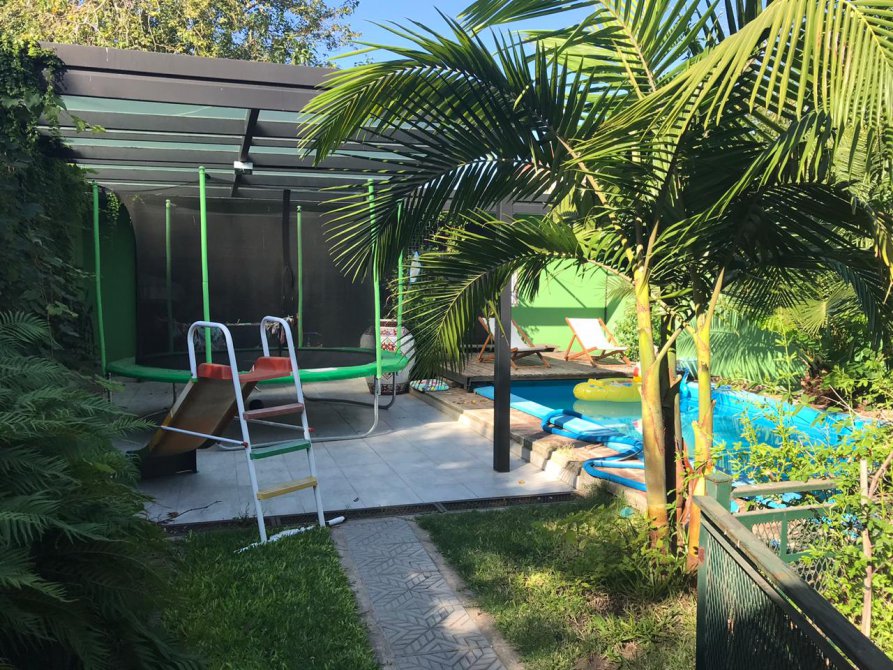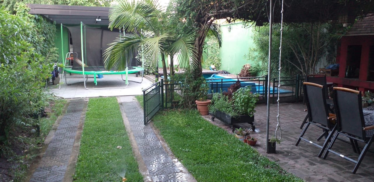 Jardin con pileta de fibra de 7 x 3. La misma cuenta con un deck corredizo que cubre la pileta para poder