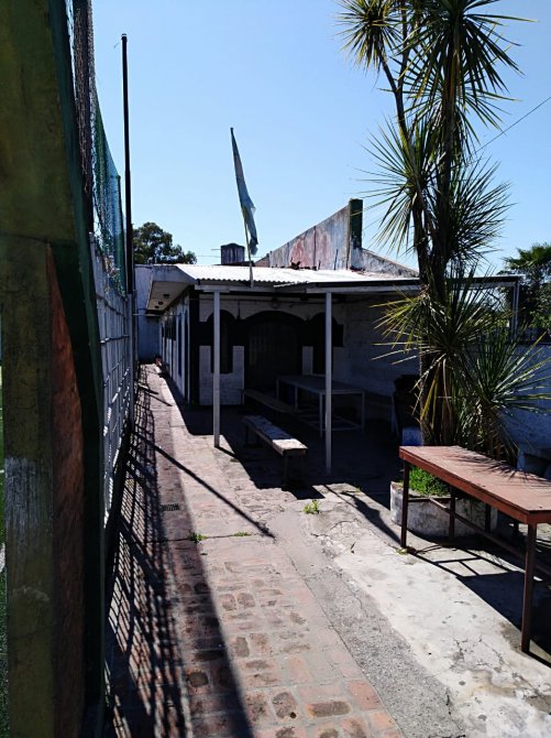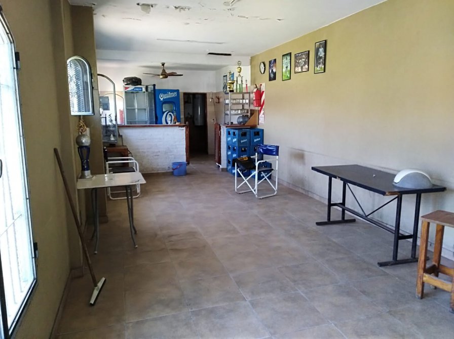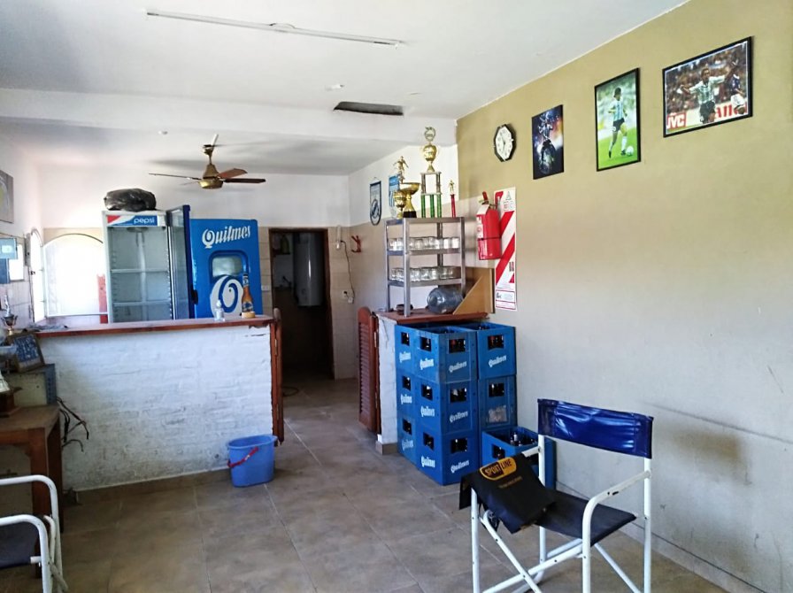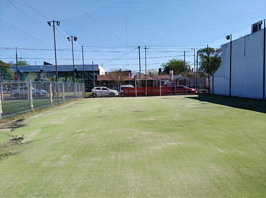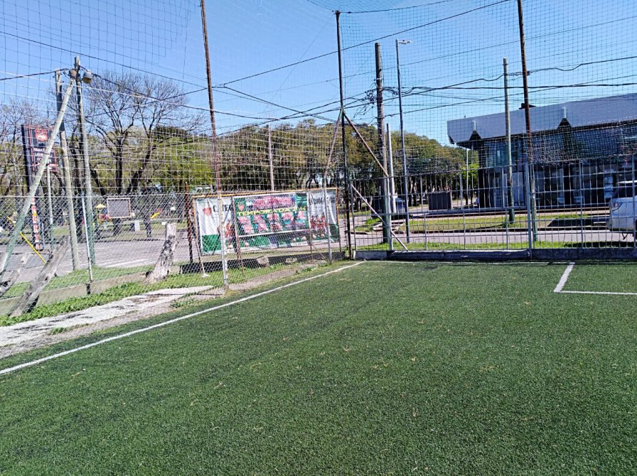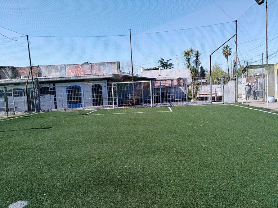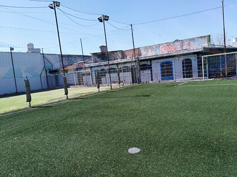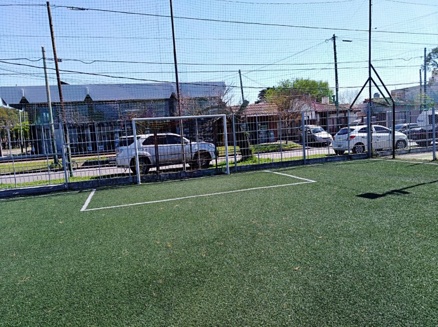 Dos cachas de futbol 5, vestuario, sala con cocina y barra de atención, baño de hombre y de mujer.